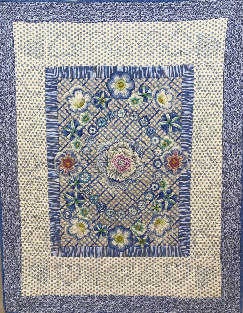 Collage, begun in a Sue Carlson workshop and finished during the pandemic. I am gradually doing this image in a variety of techniques. Have a look at the Thread Painting section for another version. A pieced version is in the works, too!