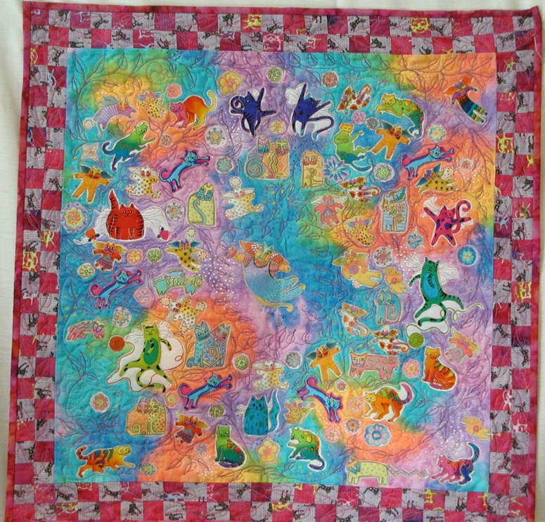 Fused kitties from Tula Pink fabric, flying geese using pattern from Sarah Bond. Background fabric spatter painted to match Tula’s vibrant palette!