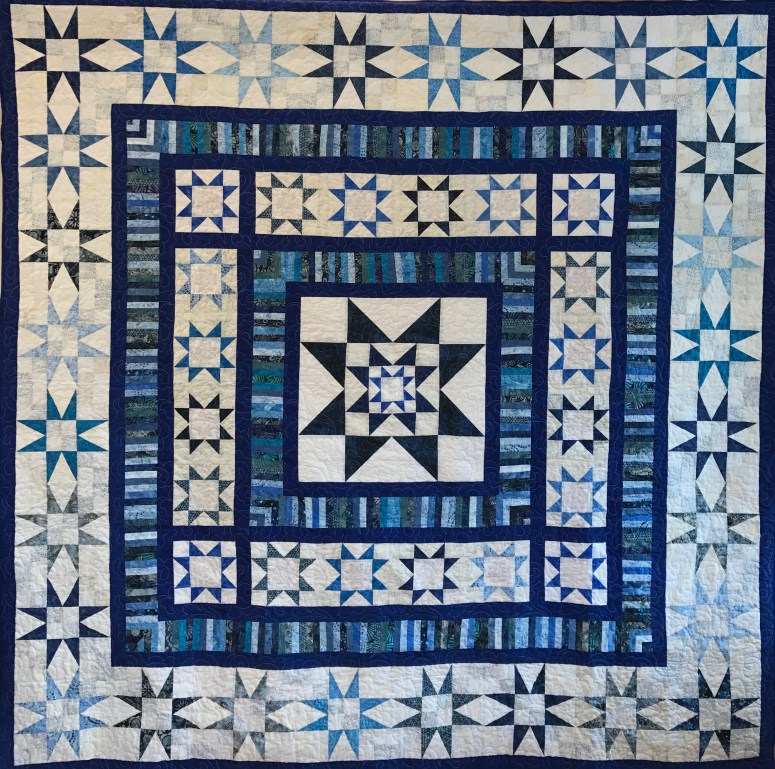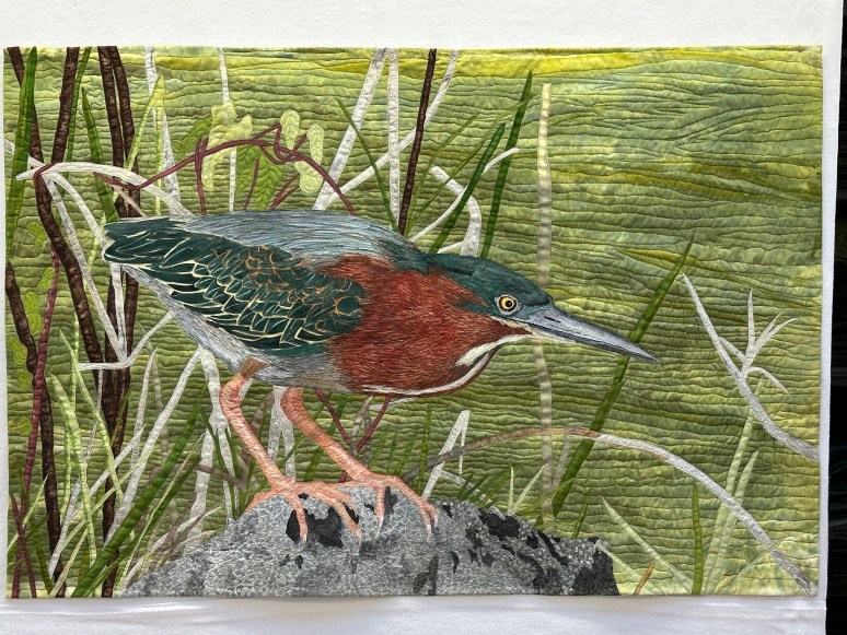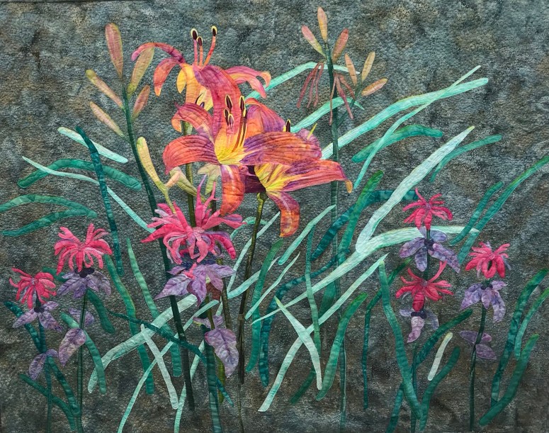 Batiks, hand-painted and commercial solids modified with Inktense blocks, pens, colored pencils. Juried entry, Houston 2024.