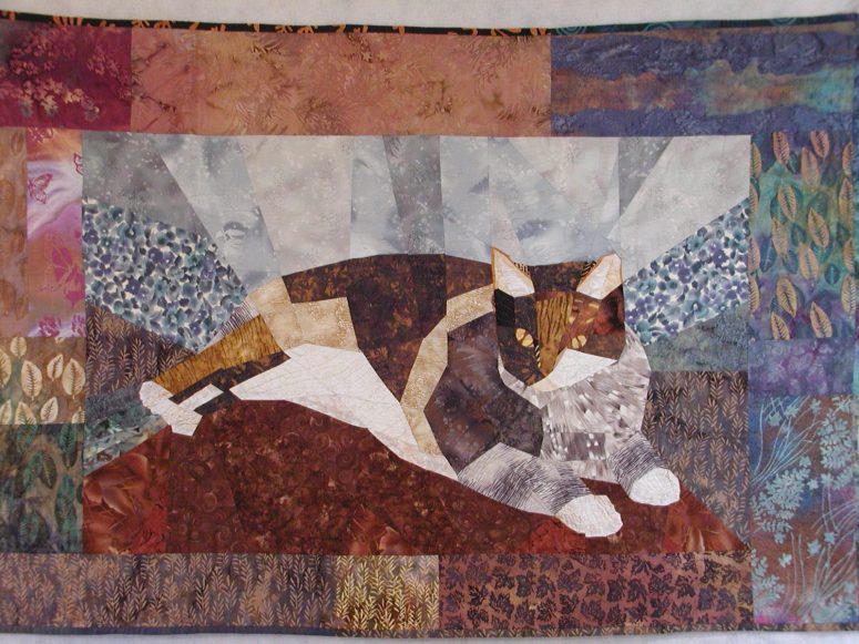 Ollie lies on a brick walk, taking the sun. My first pictorial quilt, begun in a two-day workshop with Ruth McDowell. I wanted to make a quilt in honor of Ollie, but was not at all sure I could do it. Ruth McDowell, teacher and quilter extraordinaire, over the course of two days, got me to the point where I could do it. Many, many thanks!