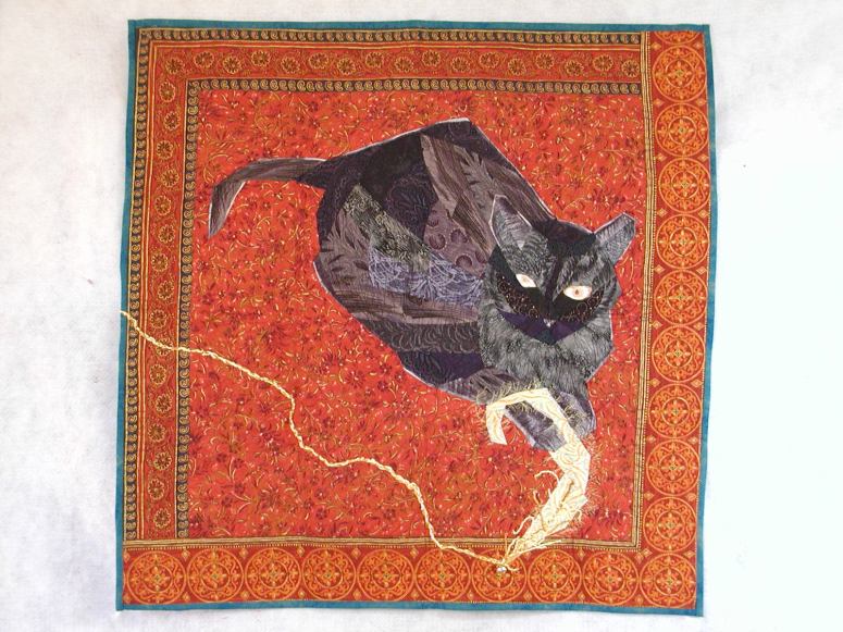 Fredlet loved playing pounce and catch with his bird toy. Always somewhat tentative, here he looks up after catching it as if to ask whether he ‘done good’! All-black kitties are a challenge! Begun in a Ruth McDowell workshop at Empty Spools Seminars at Asilomar.