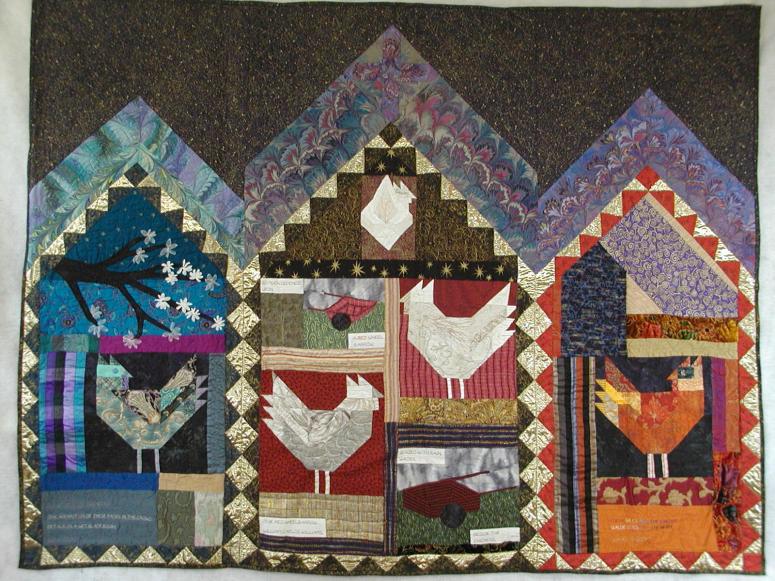 The premise of Nancy Halpern’s Chicken Delight workshop, taught at the Button Box in Needham, MA, was to make and set one of her chicken blocks in a manner inspired by a phrase including the word ‘chicken’, such as ‘chicken cordon bleu’ or ‘free-range chicken’. In the workshop, Nancy shared the phrase “Color gets all the credit, value does all the work”, and in a lunch-time discussion, this reminded me of excerpts from two poems “The image of these faces in the crowd/ petals on a wet dark bough” (from In a Station of the Metro, Ezra Pound), and “So much depends upon/a red wheel-barrow/glazed with rainwater /beside the white chickens” (from The Red Wheel-barrow by William Carlos William), and decided I needed to make three panels illuminating these poems as part of an Eastern Orthodox style triptych in honor of a mythical St. Henny who would be from Nancy’s town, Waban MA, and having an alternate title facetiously referring to a medieval book of (liturgical) hours honoring or commissioned by the Duchess of the Eggs.