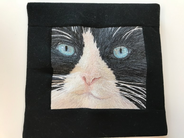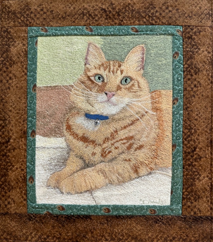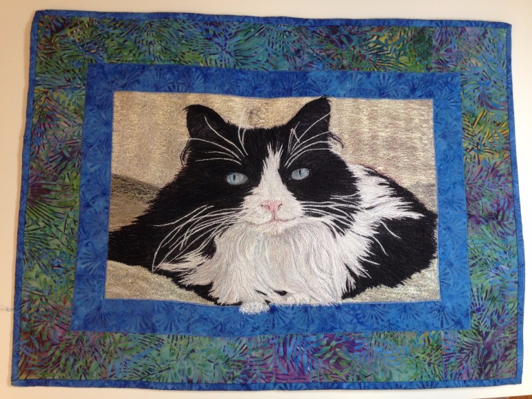 Miss Minnie is a repeat subject of my work. This was my very first thread painting, mostly completed in a workshop with Carol Shinn at Quilting by the Lake. Pale lavender and grays were used for the shadowing under her chin, and many blue- greens for her exceptionally beautiful eyes. Minnie’s vet said she had the most beautiful eyes of any cat she’d seen, and who am I to argue? They stayed blue throughout Minnie’s long life, and are the main subject of this thread painting.