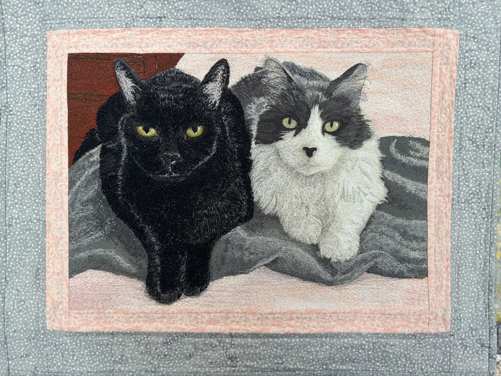 Fredlet and Tommy were frenemies, sometimes chewing on each other, and sometimes curled up together. Thread painting from an original photo. Aurifil and other thread, inkjet printed fabric, Steam-a-Seam 2, cotton backing and batting.