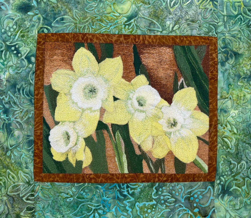 Thread painting on inkjet printed cotton fabric with mostly Aurifil threads; Steam-a-Seam 2, cotton batting and backing.